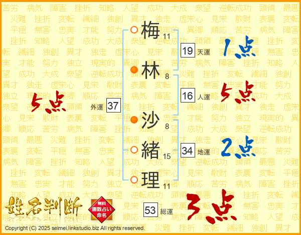 梅(11画)林(8画) 沙(8画)緒(15画)理(11画)