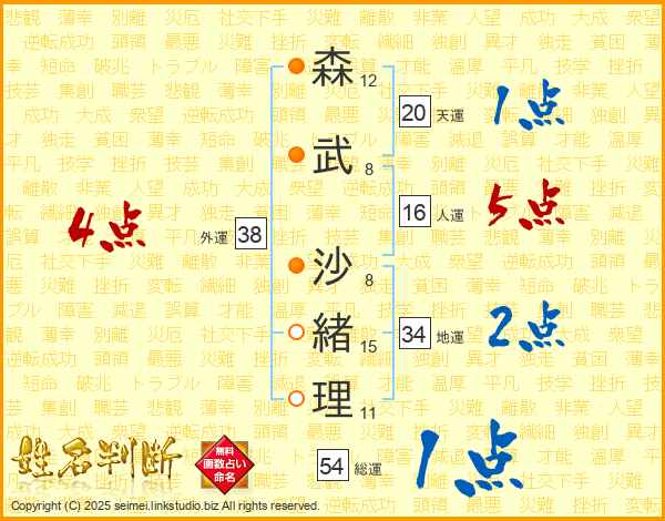 森(12画)武(8画) 沙(8画)緒(15画)理(11画)