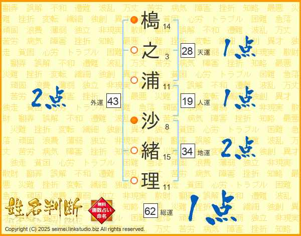槝(14画)之(3画)浦(11画) 沙(8画)緒(15画)理(11画)