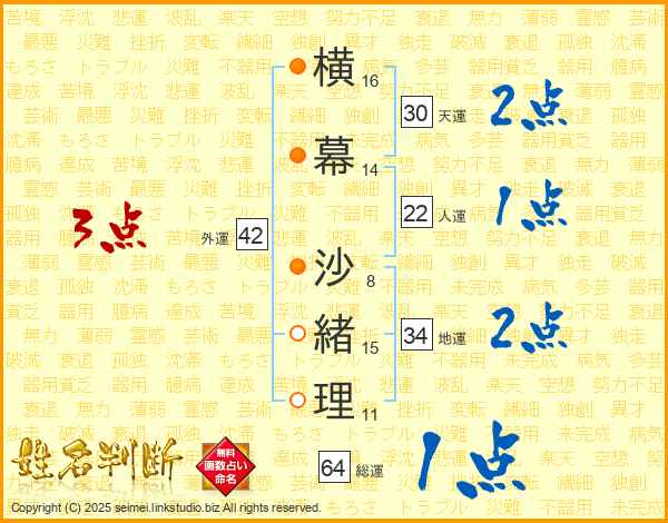 横(16画)幕(14画) 沙(8画)緒(15画)理(11画)