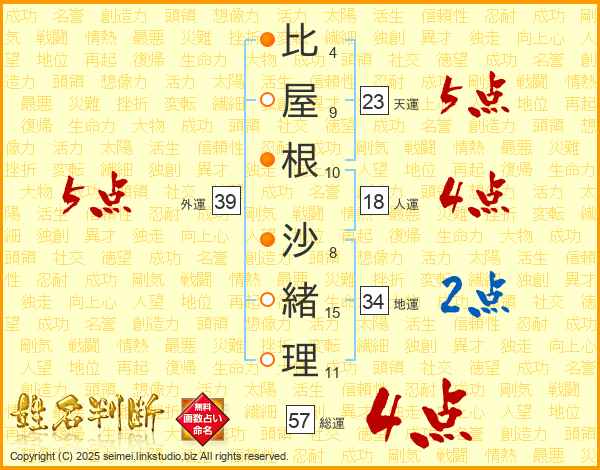 比(4画)屋(9画)根(10画) 沙(8画)緒(15画)理(11画)