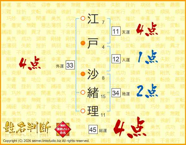 江(7画)戸(4画) 沙(8画)緒(15画)理(11画)