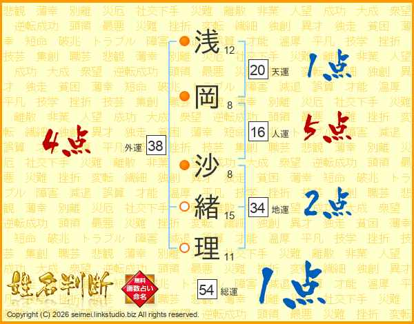 浅(12画)岡(8画) 沙(8画)緒(15画)理(11画)
