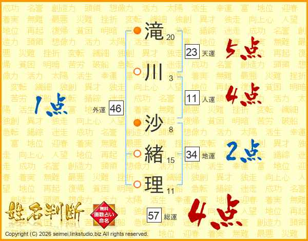 滝(20画)川(3画) 沙(8画)緒(15画)理(11画)