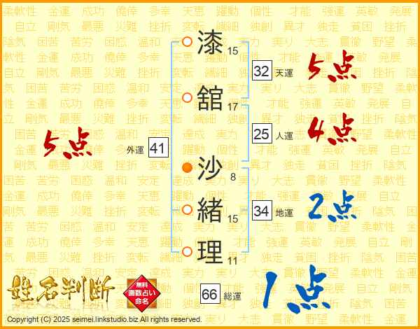 漆(15画)舘(17画) 沙(8画)緒(15画)理(11画)
