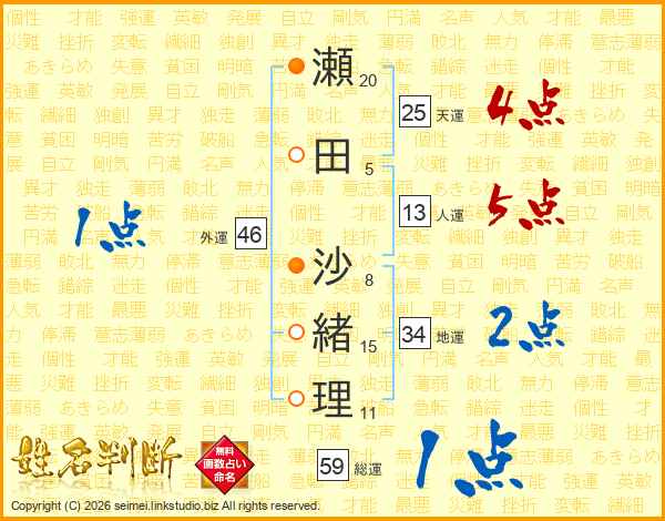 瀬(20画)田(5画) 沙(8画)緒(15画)理(11画)
