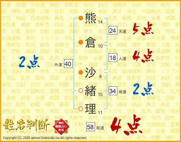 熊(14画)倉(10画) 沙(8画)緒(15画)理(11画)