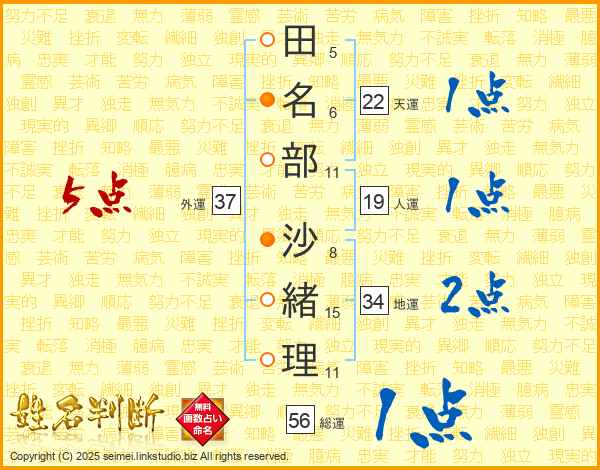 田(5画)名(6画)部(11画) 沙(8画)緒(15画)理(11画)