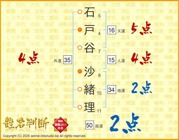 石(5画)戸(4画)谷(7画) 沙(8画)緒(15画)理(11画)