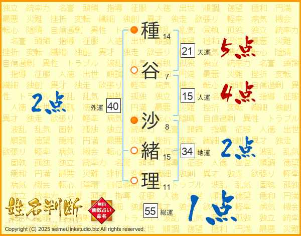 種(14画)谷(7画) 沙(8画)緒(15画)理(11画)