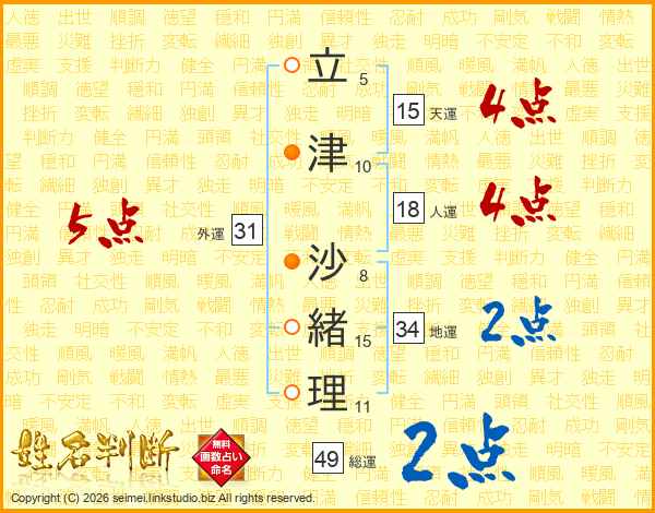 立(5画)津(10画) 沙(8画)緒(15画)理(11画)
