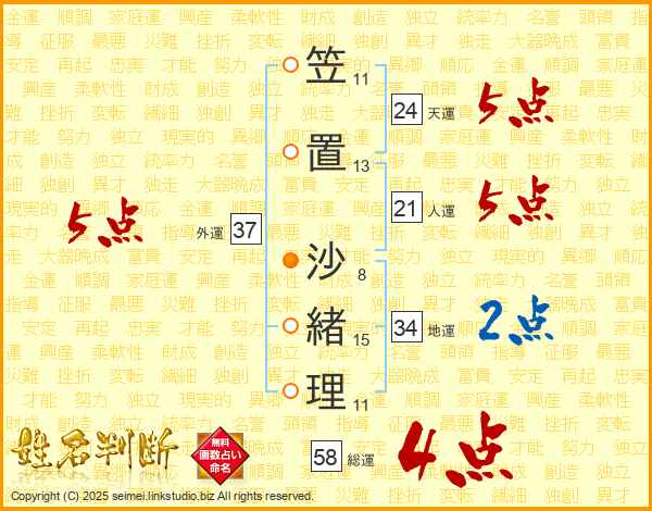 笠(11画)置(13画) 沙(8画)緒(15画)理(11画)
