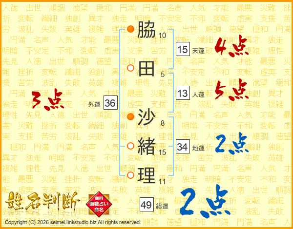 脇(10画)田(5画) 沙(8画)緒(15画)理(11画)