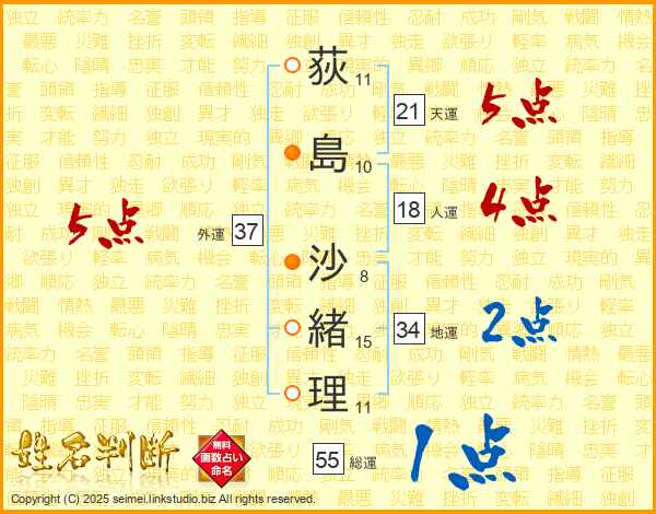 荻(11画)島(10画) 沙(8画)緒(15画)理(11画)