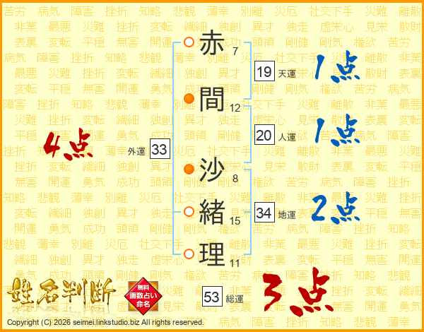 赤(7画)間(12画) 沙(8画)緒(15画)理(11画)