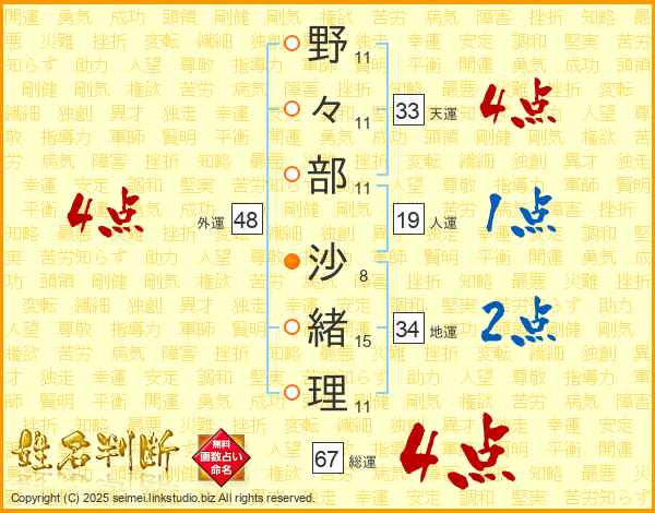 野(11画)々(11画)部(11画) 沙(8画)緒(15画)理(11画)