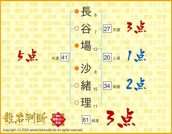 長(8画)谷(7画)場(12画) 沙(8画)緒(15画)理(11画)