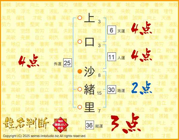 上(3画)口(3画) 沙(8画)緒(15画)里(7画)