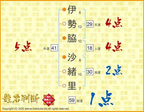 伊(6画)勢(13画)脇(10画) 沙(8画)緒(15画)里(7画)