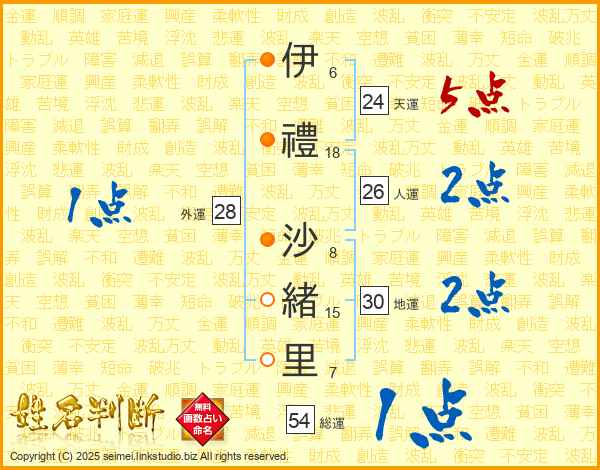 伊(6画)禮(18画) 沙(8画)緒(15画)里(7画)