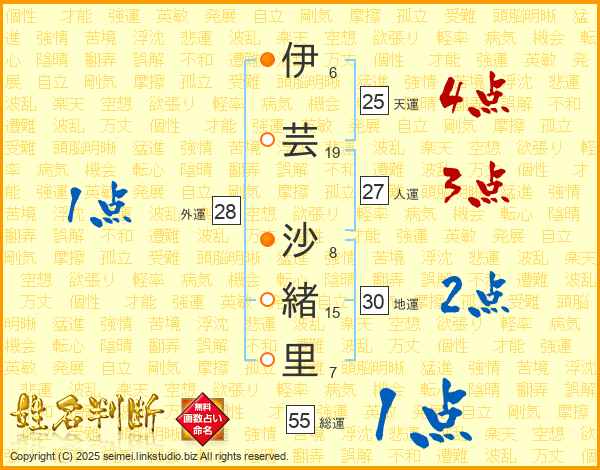 伊(6画)芸(19画) 沙(8画)緒(15画)里(7画)