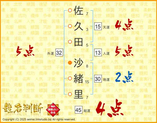 佐(7画)久(3画)田(5画) 沙(8画)緒(15画)里(7画)