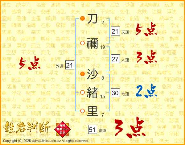 刀(2画)禰(19画) 沙(8画)緒(15画)里(7画)
