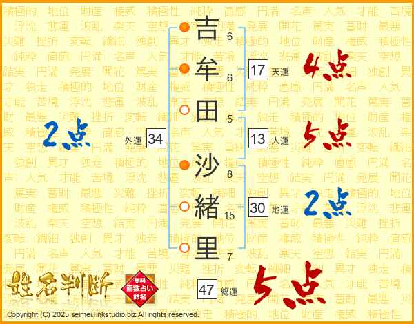 吉(6画)牟(6画)田(5画) 沙(8画)緒(15画)里(7画)