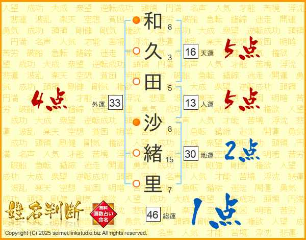 和(8画)久(3画)田(5画) 沙(8画)緒(15画)里(7画)