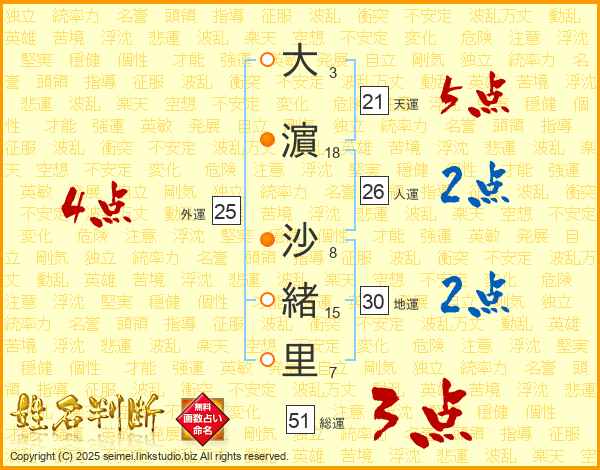 大(3画)濵(18画) 沙(8画)緒(15画)里(7画)