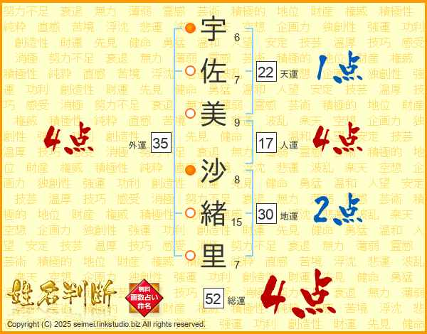 宇(6画)佐(7画)美(9画) 沙(8画)緒(15画)里(7画)