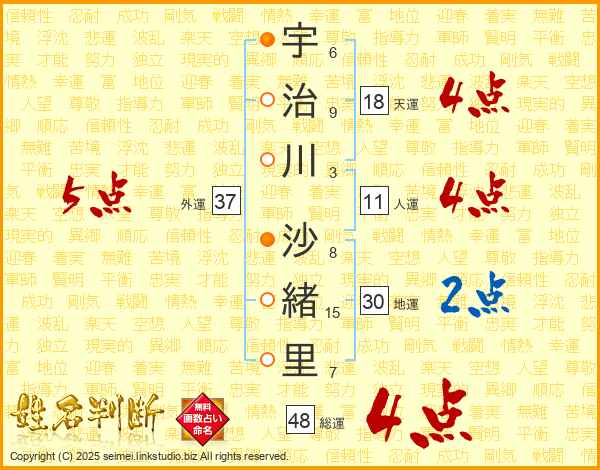 宇(6画)治(9画)川(3画) 沙(8画)緒(15画)里(7画)