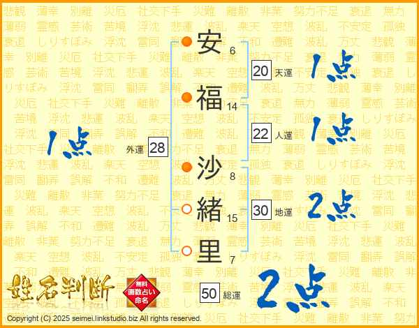 安(6画)福(14画) 沙(8画)緒(15画)里(7画)