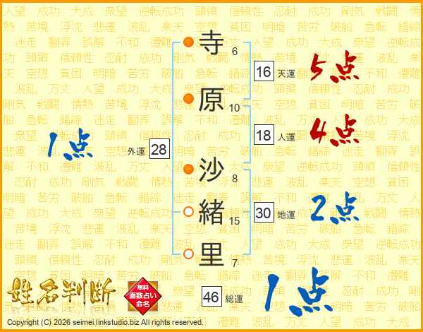 寺(6画)原(10画) 沙(8画)緒(15画)里(7画)