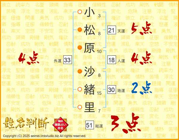 小(3画)松(8画)原(10画) 沙(8画)緒(15画)里(7画)
