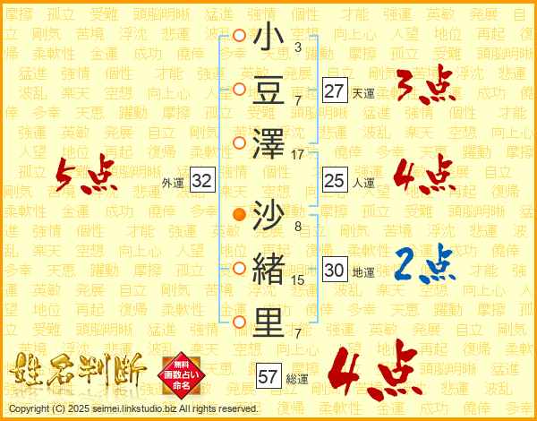 小(3画)豆(7画)澤(17画) 沙(8画)緒(15画)里(7画)