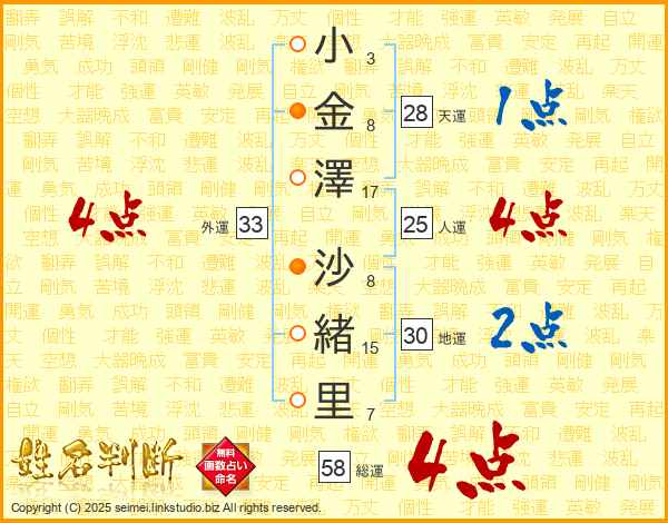 小(3画)金(8画)澤(17画) 沙(8画)緒(15画)里(7画)