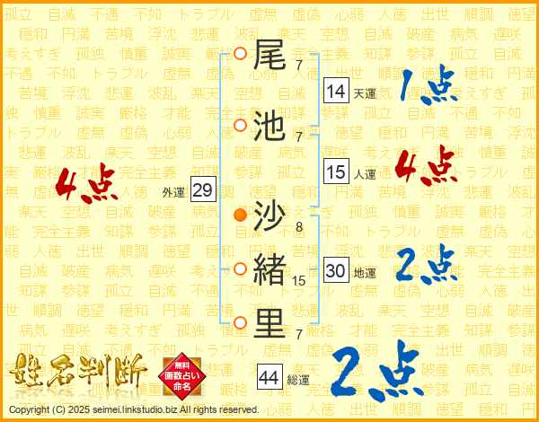 尾(7画)池(7画) 沙(8画)緒(15画)里(7画)