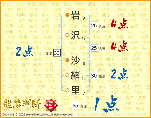 岩(8画)沢(17画) 沙(8画)緒(15画)里(7画)