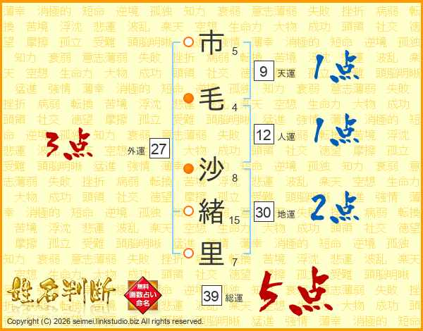 市(5画)毛(4画) 沙(8画)緒(15画)里(7画)