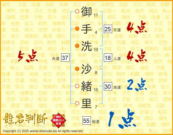 御(11画)手(4画)洗(10画) 沙(8画)緒(15画)里(7画)