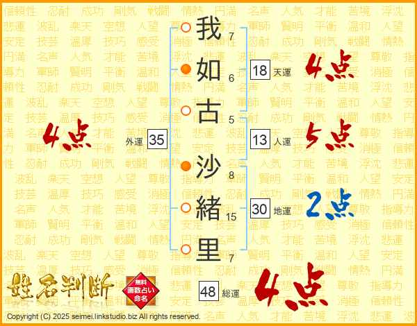 我(7画)如(6画)古(5画) 沙(8画)緒(15画)里(7画)