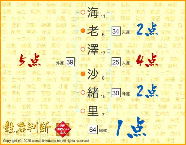 海(11画)老(6画)澤(17画) 沙(8画)緒(15画)里(7画)