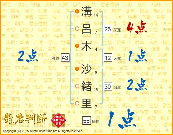 溝(14画)呂(7画)木(4画) 沙(8画)緒(15画)里(7画)