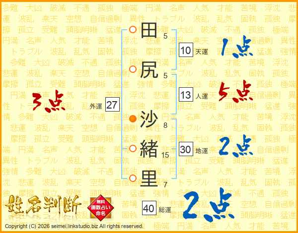 田(5画)尻(5画) 沙(8画)緒(15画)里(7画)
