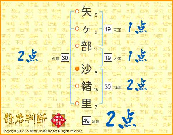 矢(5画)ヶ(3画)部(11画) 沙(8画)緒(15画)里(7画)
