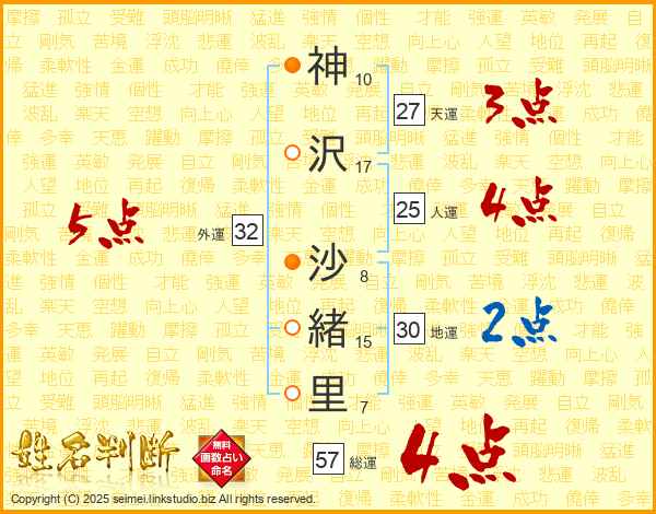 神(10画)沢(17画) 沙(8画)緒(15画)里(7画)