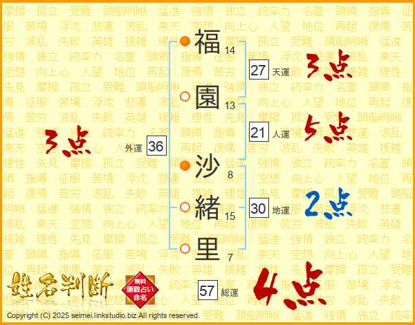 福(14画)園(13画) 沙(8画)緒(15画)里(7画)