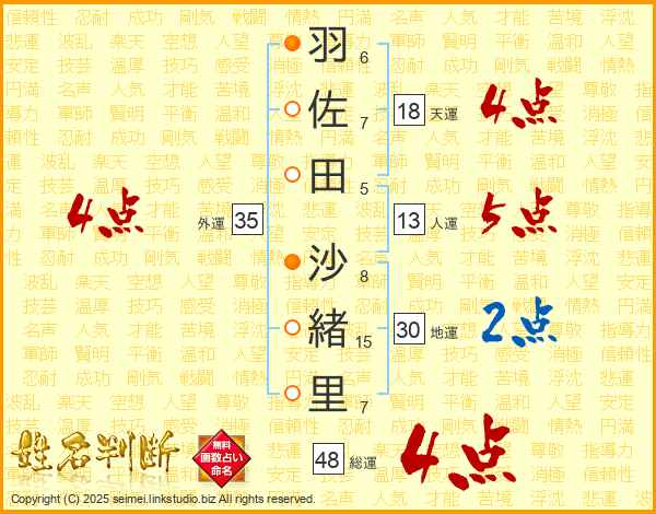 羽(6画)佐(7画)田(5画) 沙(8画)緒(15画)里(7画)