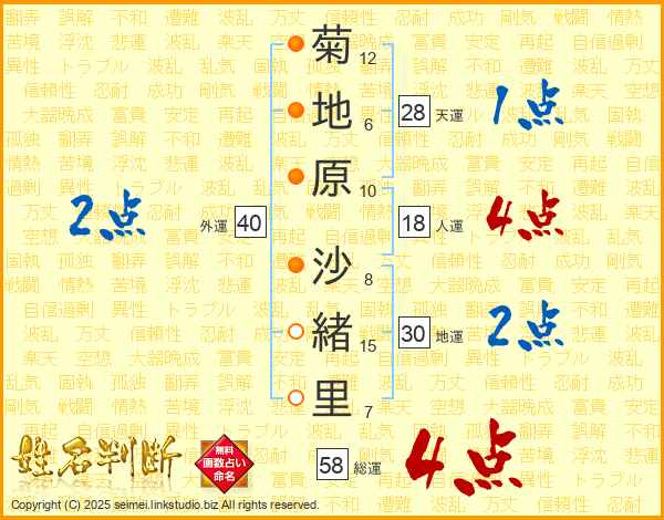 菊(12画)地(6画)原(10画) 沙(8画)緒(15画)里(7画)